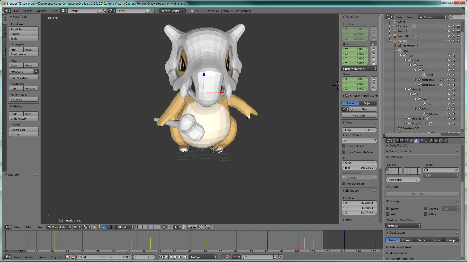 Modelagem esqueletal de um Pokémon (Eevee) em Blender (alunos de 2016.2)